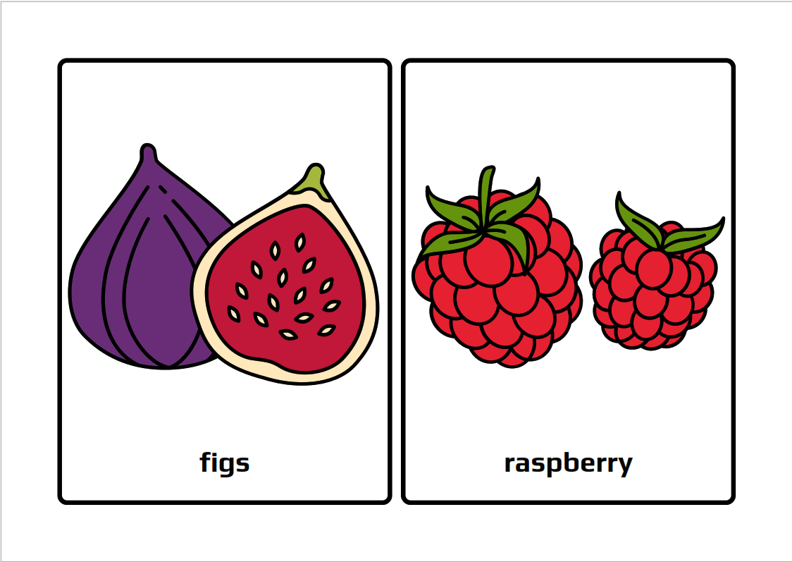 Bright and colorful flashcards featuring a variety of fruits from around the world. A simple and effective tool for building vocabulary and fruit recognition in young children.